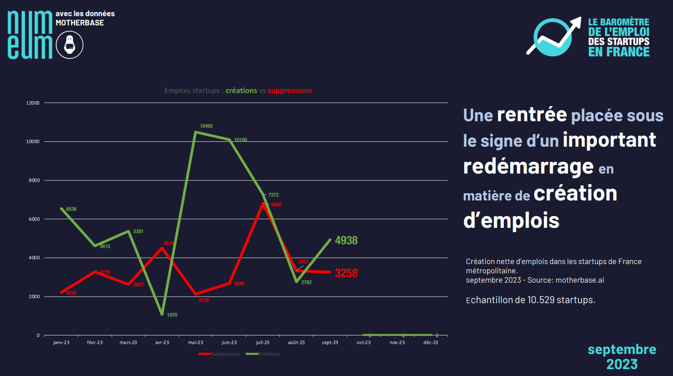 As a reminder, this summer period (July and August combined) saw a large number of startups (1,800) creating jobs, but even more (2,200) shedding them. In September, fewer than 1,900 startups shed jobs (around 3,200), almost 200 fewer than the previous month. At the same time, nearly 2,150 startups created jobs (almost 5,000 positions), i.e. 700 more than in August!