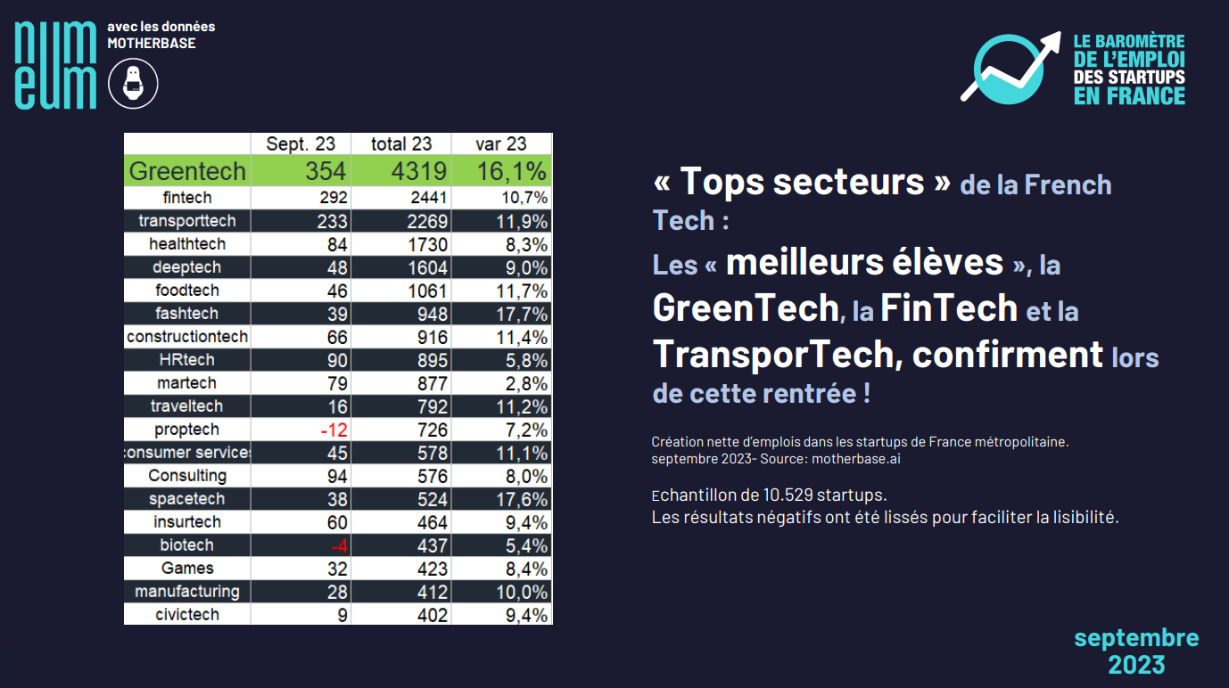 As far as the “Top sectors” of French Tech are concerned , the “best students” are also confirming their position this autumn! GreenTech remains the undisputed “top of the class” sector(+ 350 jobs). FinTech (almost 300 jobs) and TransportTech(almost 150 jobs) are still the sectors that make up the podium. However, attention should be drawn to the PropTech and BioTech sectors, which seem to be slipping back slightly.