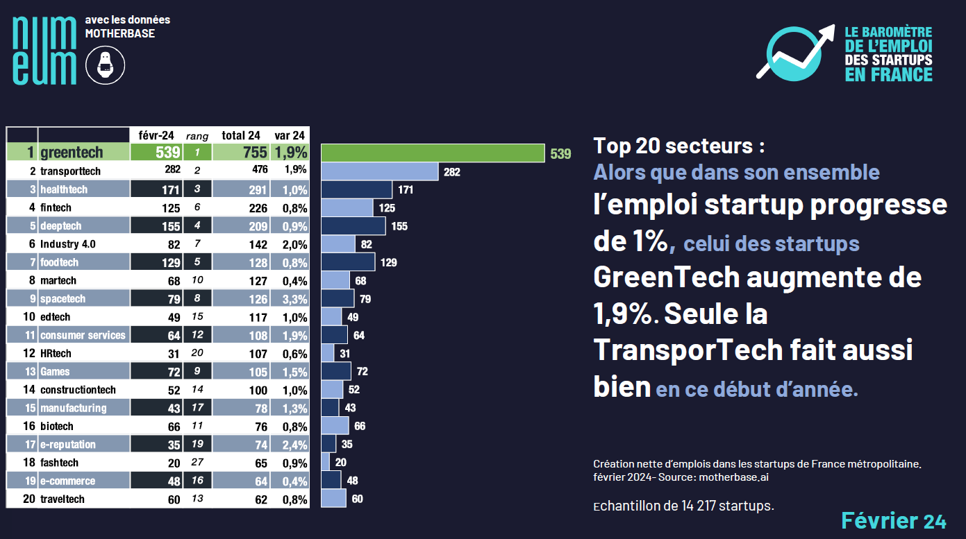 As far as our sector analysis is concerned, GreenTech continues to stand alone at the top of the Top Sectors ranking. In February, one job in four of the national total came from GreenTech startups. Over January and February combined, the sector accounted for over 22% of all jobs created by French Tech. The sector is therefore back on the same footing as in 2023, or even better, since one in five jobs came from these startups over the whole of 2023. While overall startup employment is up by 1%, GreenTech startup employment is up by 1.9%. That’s almost twice the national average. Only TransporTech did as well at the start of the year (also 1.9% growth). This sector, which finished third in 2023, has moved up one place since the start of the year. For the time being, the “losing” sector compared to last year is FinTech. This sector has slipped from 2nd to 4th place, and is progressing less than the national average (to within 0.2%). HealthTech closes the podium of this first 2024 stage.