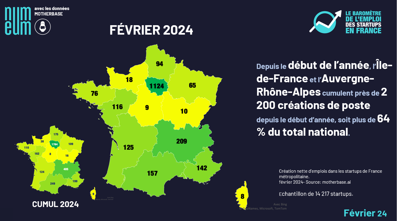 At the start of 2024, our regional analysis could be summed up in the following formula: “We take the same and we start again”. Indeed, Île-de-France and Auvergne-Rhône-Alpes are resuming their role as regional locomotives of startup employment. These two regions have created almost 2,200 new jobs since the start of the year, representing over 64% of the national total. In February alone, Île-de-France accounted for more than one in every two jobs created (52%). By way of comparison, for the whole of last year, the Paris region created 58% of the national total. It’s also interesting to note that in January, as in February, all regions of France generated jobs in startups.