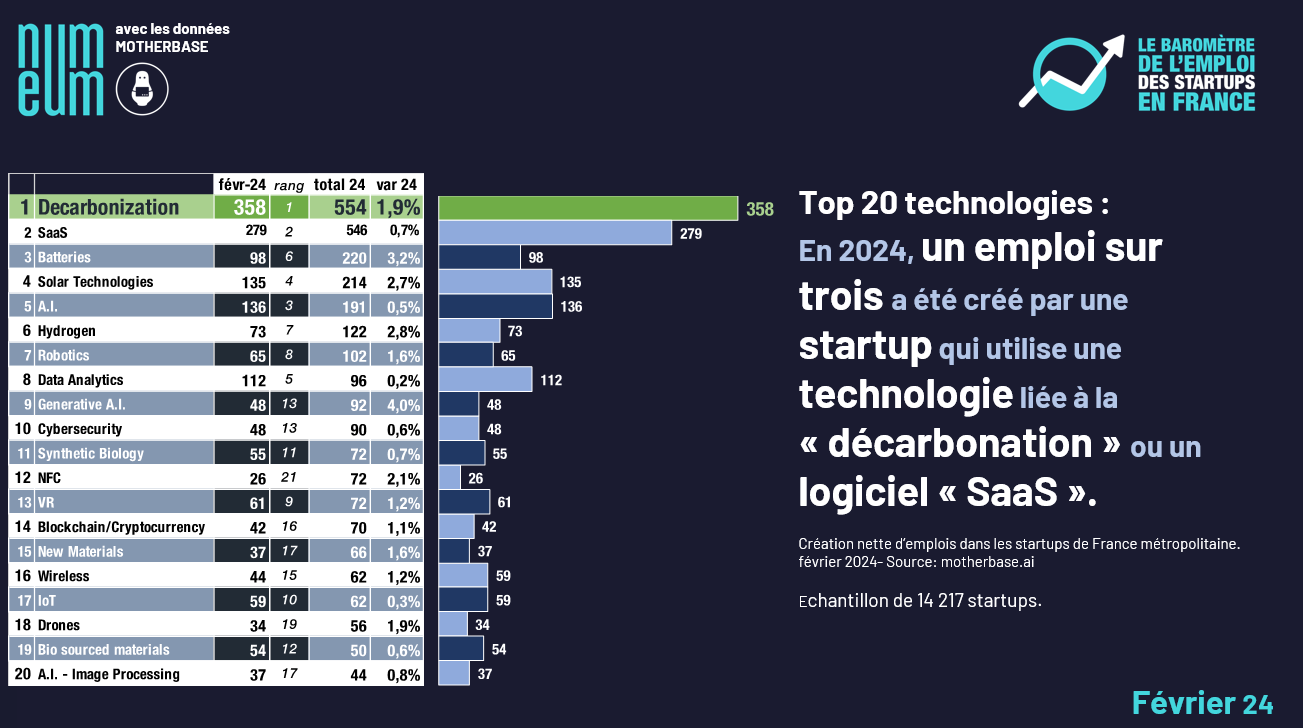 New for the 2024 edition, our barometer now offers an analysis by “technology”. For the first ranking of the year, two technologies stand out: “Decarbonization” and “SaaS software”. Since the beginning of January, these two technologies have created a total of 1,100 new jobs. In other words, almost one job in three has been created by a startup using one of these technologies since the beginning of the year.