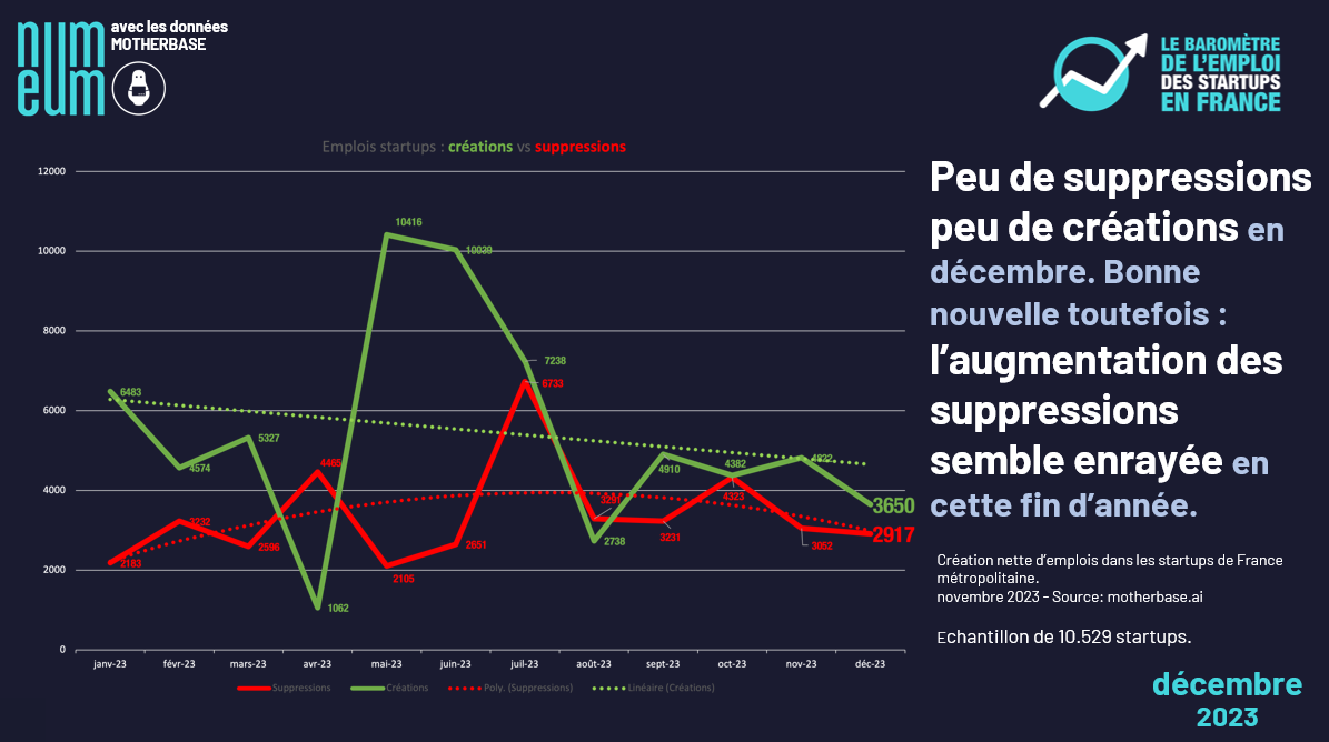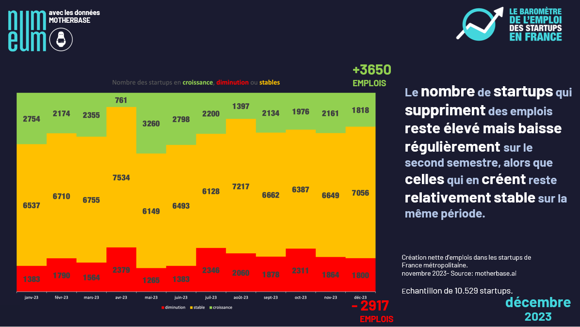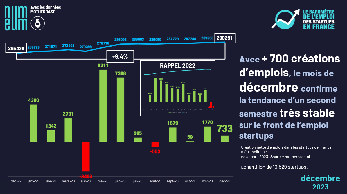 With over 700 jobs created in French startups last December, the year 2023 ends with a calm and stable second half. Over H2 as a whole, nearly 4,200 jobs will have been created, averaging out at nearly 700 per month. December therefore reflects this trend perfectly. By way of comparison, H1 as a whole saw over 20,700 net new jobs created, i.e. an average of almost 3,500 per month. In other words, the last six months of the year were five times less productive than the first six.