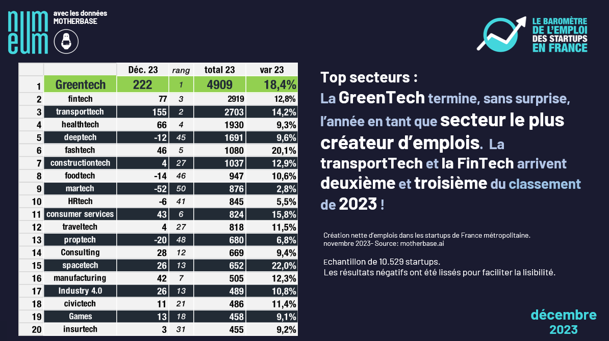 Unsurprisingly, GreenTech finishes way ahead of the pack as the most job-creating sector for French startups. This sector generated some 5,000 net new jobs in 2023, i.e. almost one in five jobs in French Tech last year. TransportTech and FinTech come second and third respectively in this annual ranking.