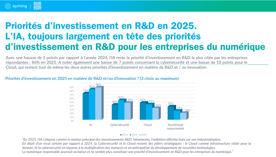 En 2025, l’IA s’impose comme le premier moteur des investissements R&D. Bien qu’affichant un certain recul par rapport à 2024, la cybersécurité et le Cloud restent des piliers stratégiques : le Cloud comme infrastructure vitale pour la donnée, et la cybersécurité en réponse à la multiplication des menaces et en anticipation du développement de nouvelles technologies.