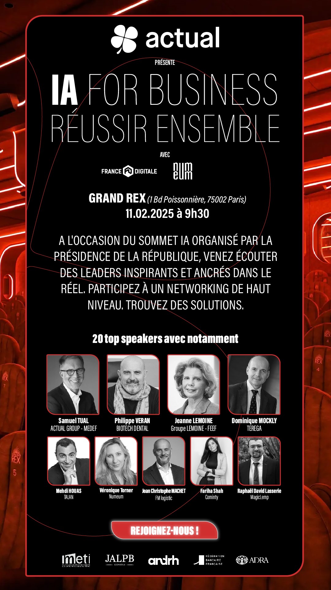 À l’occasion du Sommet pour l’action sur l’Intelligence Artificielle organisé par le président de la République et l’Elysée, nous organisons avec Actual Group, acteur clé du monde du travail en France, un événement exclusif au Grand Rex de Paris, le 11 février à 9h30, en collaboration avec France Digitale, Numeum, le METi, l’ADNRH, la FBF, l’ADRA notamment